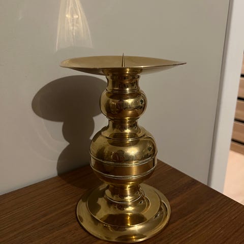 En klassiske lysestake i tung messing. Produsert av Boyes Metalkunst i Danmark. Designet av Jens Harald Quistgaard. Klassisk dansk design. Høyde 17 cm.