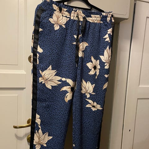 ONLY bukse for dame i størrelse 38. Buksen er rød med blomstrete mønster og er laget i polyester. Den har strikk i livet og knytebelte foran, samt rette ben. Stoffet er lett og faller mykt. Passer som hverdagsbukse eller til mer pyntede anledninger, avhengig av styling.