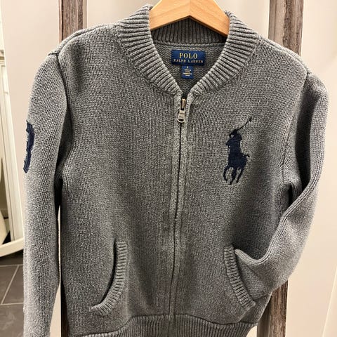Polo Ralph Lauren genser for barn, unisex, i størrelse 140 10-12 år, Genseren er grå og har glidelås i front. Den har ribbestrikkede kanter nederst, i ermelinningene og i halsen. På brystet er det et stort Polo Ralph Lauren-logo og på den ene armen et tallmotiv. Passer til hverdagsbruk og kan brukes alene eller som et ekstra lag over andre plagg.