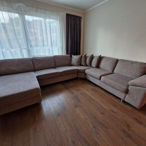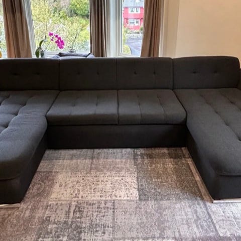 Godt brukt svart sofa, med noen synlige defekter på sidene av sofaen. Vi selger den fordi den er for stor for rommet.