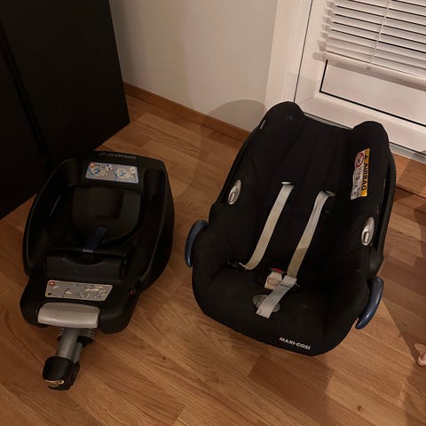 Svart maxi cosi bilstol med nyfødt innlegg (kan tas inn og ut). Pent brukt til 2 barn. Veldig fornøyd med dette selv. Isofix base :)