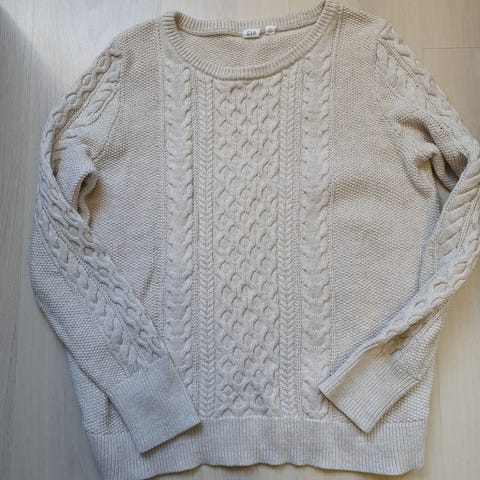Hvit/perlegrå genser med fine detaljer, litt nuppete men det fjernes lett med nuppefjerner. Kan evt gjøres før sending/kjøp. Står str xl men er nok mer en str m