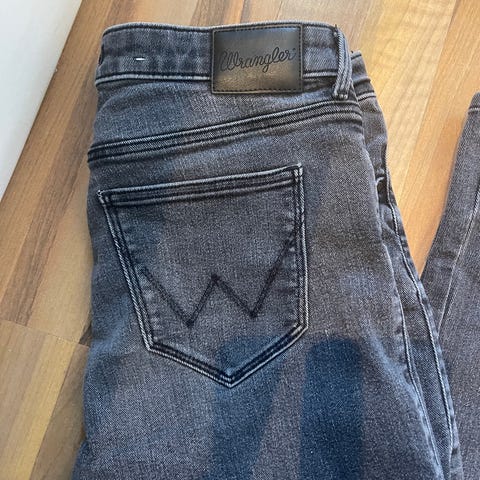 Wranglerbuksen er litt brukt, men pent brukt. Ikke noe synlig slitasje. Størrelse W31 L32