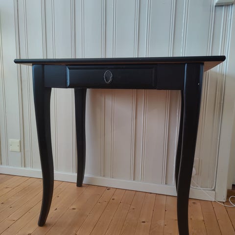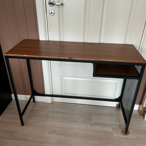 Lite brukt og velholdt skrivebord/laptopbord fra IKEA (utgått modell). Plassbesparende og egner seg godt for hybler o.l. Har hjul på den ene siden, så er lett å flytte på. Et par merker ellers i god stand.
