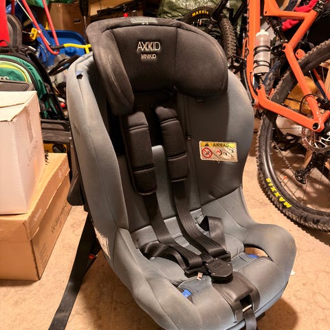 Axkid Minikid barnesete for barn opptil 25 kg. Barnesetet er bakovervendt og har integrert internsele med polstrede skulderreimer. Setet festes med støtteben og underforankringsstropper.