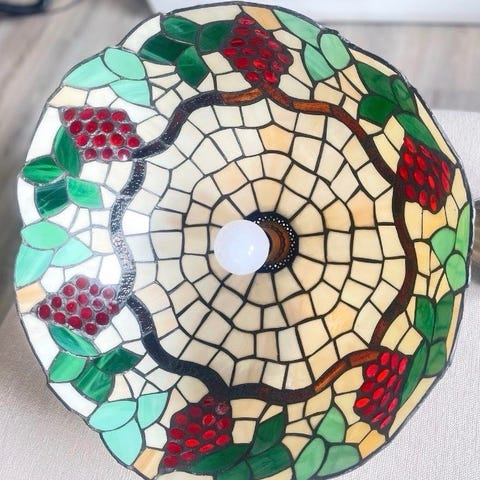 En vel fungerende stor vintage eller art deco Tiffany taklampe, denne har ikke bruksspor eller bruksslitasje, hel og pen. Gir flott lys med rett pære og styrke. Kommer med metall bronsefarget takkopp, kjetting og brun ledning, ca. 1 m, kjetting kan kortes ned. Selve lampen har en diameter på ca. Ø46cm, høyde selve lampen er ca. 27cm. Sokkel passer for E27 pære, pære er ikke inkludert.