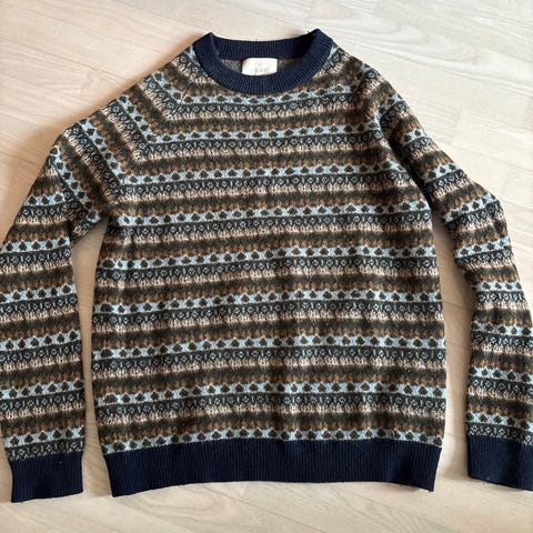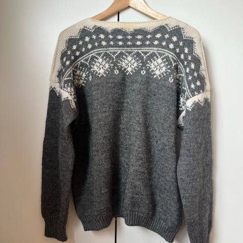 Gran Sasso genser for herre i størrelse M. Genseren er i beige med rund hals og mønster øverst rundt bryst og skuldre. Ribbestrikkede kanter nederst på ermer og i livet. Passer til hverdagsbruk og kan kombineres med både jeans og chinos.