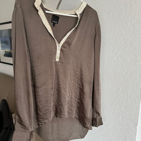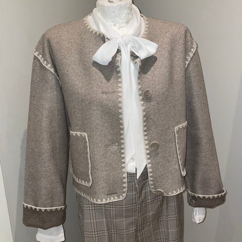 Ane Mone jakke i beige bomull for dame i størrelse XXL. Jakken har strukturert vev, dekorative knapper i front og påsydde lommer. Den har råkant-detaljer langs kanter som gir et uformelt uttrykk. Passer som lett ytterjakke eller som lag over bluser og kjoler. Farge og materiale gjør den enkel å kombinere med ulike antrekk i hverdagen og til enklere penere anledninger. Selges kr 700,-. Nypris var kr 1.599,-