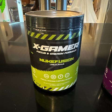 X-Gamer Focus & Energy Formula energidrikkpulver i smaken X-Rayz Grape. Produktet er et pulver som blandes med vann for å lage en energidrikk, beregnet for økt fokus og energi. Leveres i beholder som vist på bildet, med skrulokk for lukking etter bruk. Egnet for bruk før eller under lengre spilløkter, trening eller andre aktiviteter der man ønsker et koffeinholdig energitilskudd. Innhold, næringsinformasjon og anbefalt dosering fremgår på emballasjen.