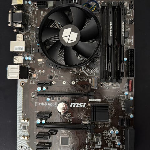 Selger en pakke med hovedkort, prosessor og kjøler.