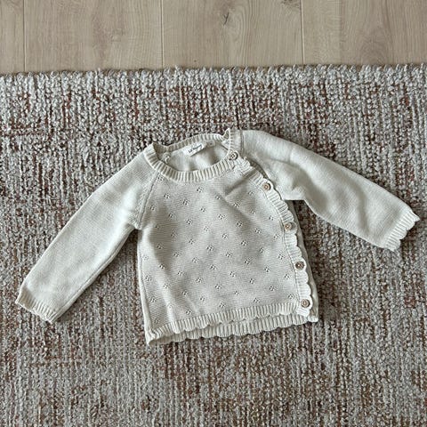 Usikker på størrelse, men tipper rundt str 62 når jeg måler den opp mot annet babytøy.
