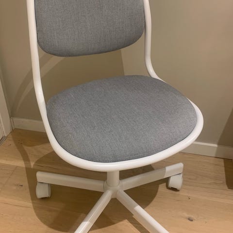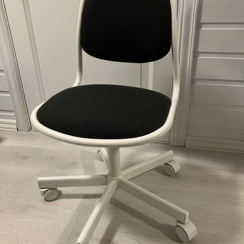 IKEA kontorstol til barn med sete og rygg i mørk grå tekstil og hvit ramme. Stolen har femstjernet fot med hjul og høydejusterbar sittehøyde. Egnet som arbeidsstol ved skrivepult for barn. Forholdsvis pent brunt, med noen mindre bruksspor på ramme og sete. Se bilder for detaljer.