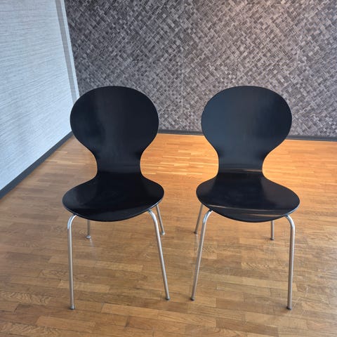 Spisestoler i kunstskinn. Sort med stålben. 400kr/stk