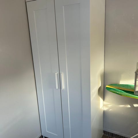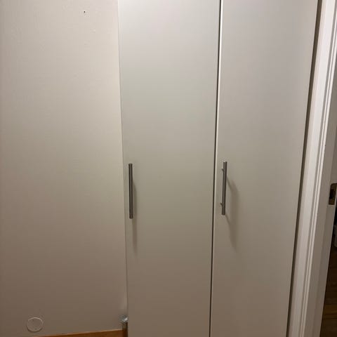 Gis bort ved henting. Må demonteres. Noen synlige overflate merker på venstre dør. Kan kanskje skrubbes bort. Samt noen sparkelflekker på siden til venstre. Kan pusses ned. En side med hylle og et med stang. En stor hylle øverst.