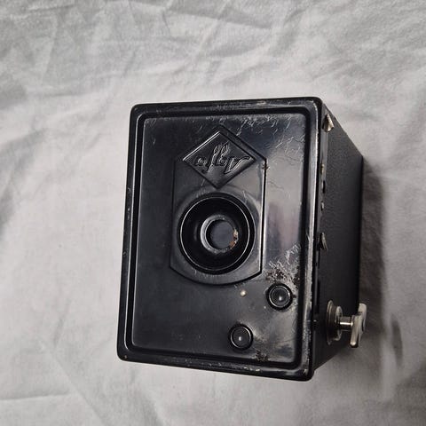 Agfa Isola I analogt kamera med originalt brunt skinnetui. Kameraet er et mellomformatkamera for film, med enkel betjening og mekanisk lukker. Skinnetuiet beskytter kameraet under oppbevaring og transport.