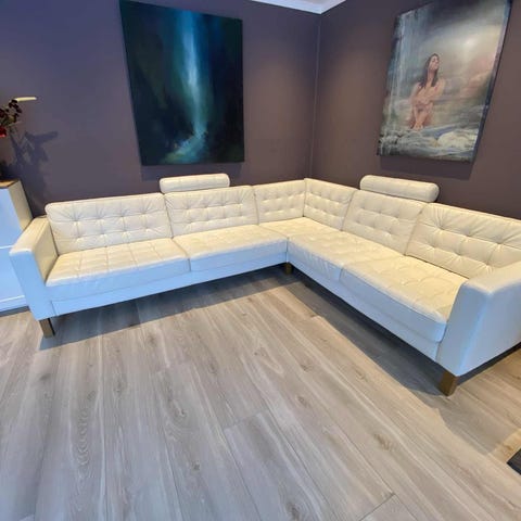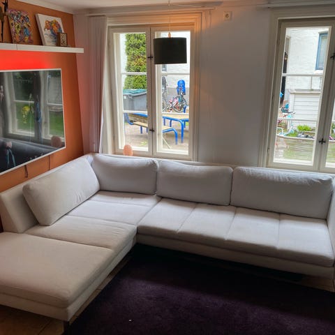 Godt brukt hvit hjørnesofa gis bort. Den har noen bruksmerker og slitt fjæring i hjørnedelen.