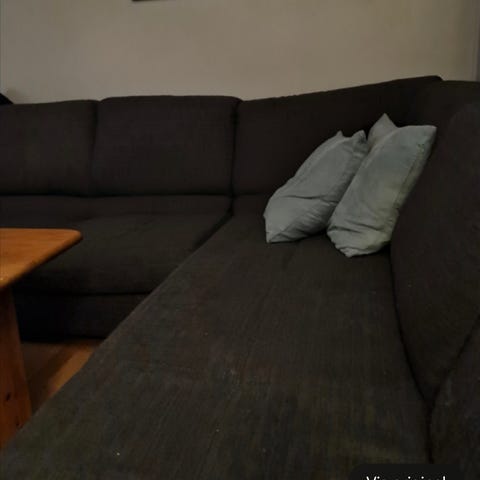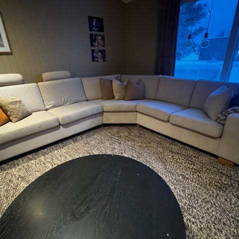 Sofaen er delt i to deler. Den korteste ca 180 cm og den lengste ca 220 cm