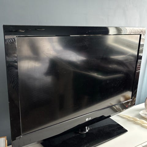 LCD-TV med 32 tommers skjerm og innebygd bordstativ. På baksiden finnes tilkoblinger som blant annet komponent, SCART og andre analoge innganger (ingen moderne smart-TV-funksjoner er synlige på bildene). Strømkabel er fastmontert i TV-en.