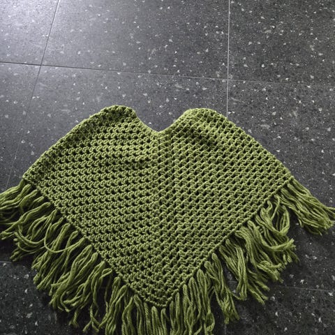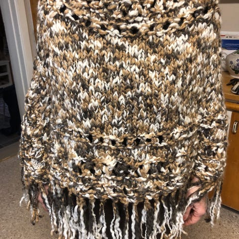 Deilig, varm og god, vaskes for hånd eller i maskin., Ponchoen holder seg bra. Mykt materiale. Har en igjen i lilla, til voksen onesize. Blandet materiae, god og varm. Sender eller til henting.