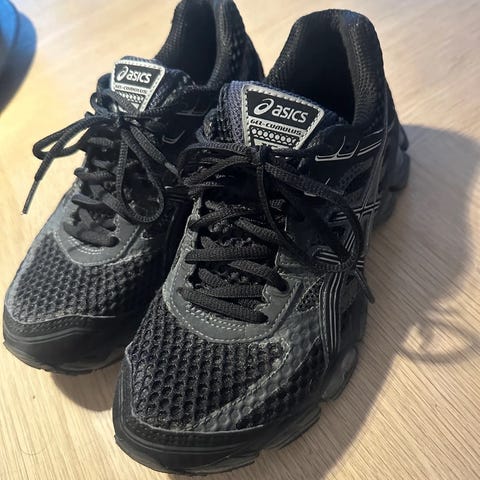 Brukt 1 gang. De var for små. Asics løpesko i størrelse 39. Skoene er laget for løping og har overdel i pustende meshmateriale. Yttersålen har gummimønster som gir godt grep mot underlaget. Fargen er hovedsakelig svart med lyse detaljer og hvit mellomsåle. Passer til løping og annen trening der det er behov for lette og stabile sko.