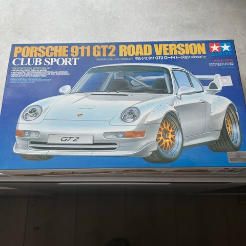 Porsche 911 GT3-settet fra Tamiya viser en sportsbil med detaljerte karosseri- og interiørdeler. Modellen leveres som byggesett i plast som må monteres og vanligvis males.