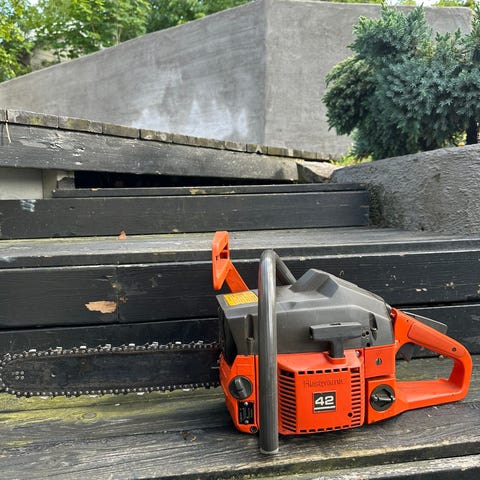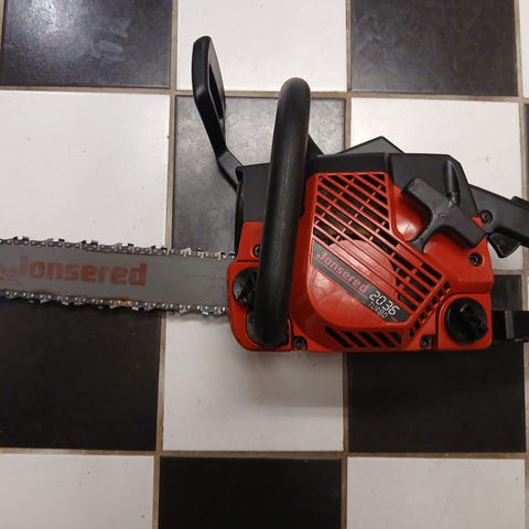 Den har knekt choke hendel men den fungerer. Kjedebrems er iorden og stoppknappen.