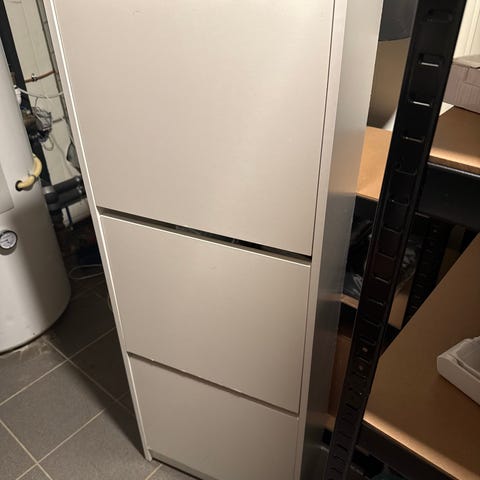 Selger et pent brukt skoskap i hvit farge. Skapet har god plass og rommer ca. 12–13 par sko.