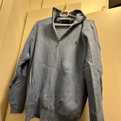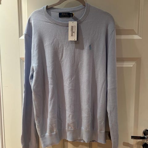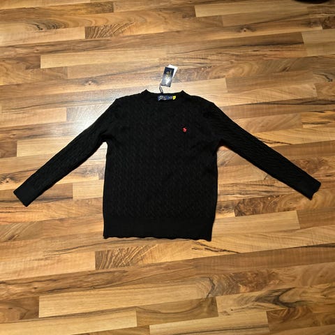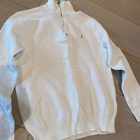 Ralph Lauren Polo genser for herre i størrelse M. Genseren er hvit og laget av bomull, med klassisk flettestrikket mønster og brodert Polo-logo på brystet. Rund hals med ribbestrikket kant, samt ribbede mansjetter og linning. Passer som en enkel og nøytral hverdagsgenser eller til mer pyntede anledninger.