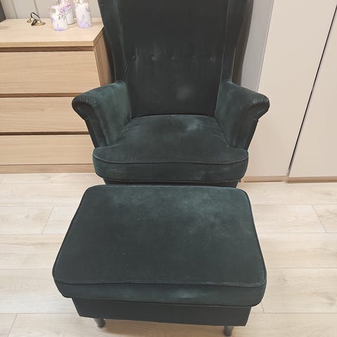 Strandmon lenestol fra IKEA, mørk grønn farge. Litt merkelig fargeskjær på bildene pga lyset i boden hvor den nå står plassert - i ei stue ser den mye finere ut. Puff medfølger. Nypris: 3995kr