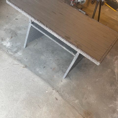 Rektangulært hagebord i brun farge. Bordet har en glatt bordplate og understell i flettestruktur, egnet for bruk utendørs på terrasse eller i hage. Passer som spisebord eller arbeidsbord ute. Størrelse: 150cmx97cm