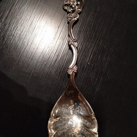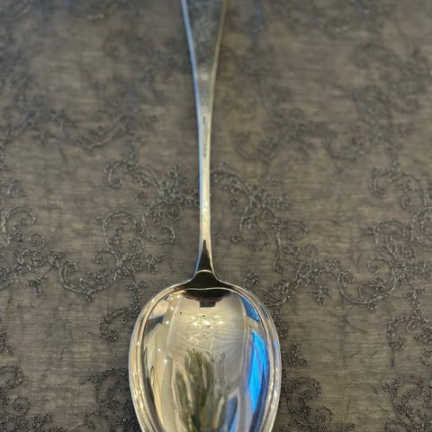 Sølv skje med dekorativt, svunget skaft og utskårne ornamenter i enden. Skjeens skål har vifteformet preg med gravert blomsterdekor. På baksiden av skaftet finnes stempler som angir produsent og sølvkvalitet. Passer som serveringsskje, samleobjekt eller til bruk sammen med annet sølvbestikk. Eventuelle mål og vekt kan kontrolleres ved behov. Oldemor skje 14,5 cm har ikke vært i bruk trenger en puss ca 19 g