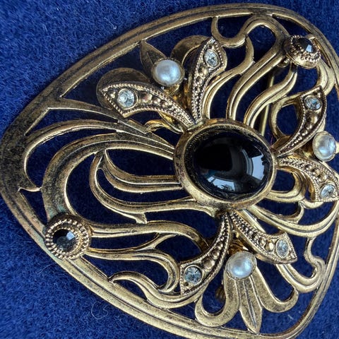 Nål, gullfarget med grønn strass