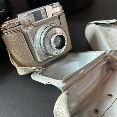 Retro Bella-kamera (med tilhørende veske) produsert i Tyskland på 50-tallet selges til høystbydende over kr 700. Funksjonalitet ikke testet.