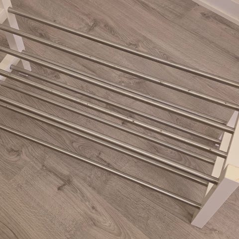 Brukt skohylle i metall gis bort