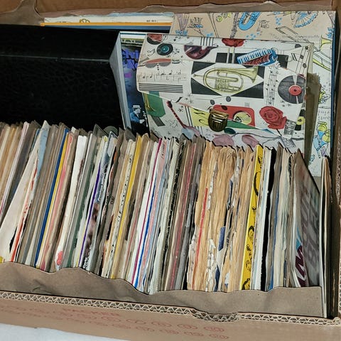 Banankasse med masse vinyl, alt fra Beatles, Stones, klassisk, jazz, norske.