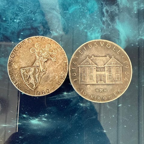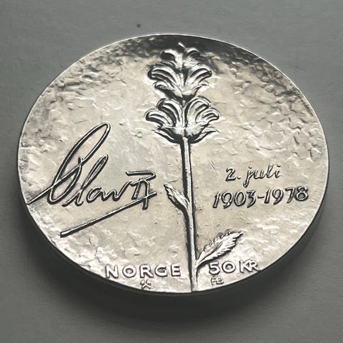 Selger norsk 50 kroner sølvmynt preget i 1978 i forbindelse med Kong Olav V sitt 75‑årsjubileum. Klassisk norsk sølvmynt som er enkel å omsette og godt kjent i markedet.