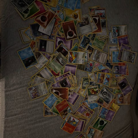 Samling med ulike Pokémon-kort lagt ut i rader på bord. Kortene ser ut til å være fra forskjellige serier og utgivelser, med både Pokémon-kort og energikort i ulike typer og farger. Antall kort og eksakte utgaver fremgår av bildene.