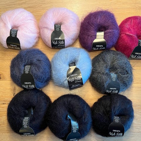 9 nøster mohair hvorav 6 stk er Lieve Mondial og 3 stk er Bella Permin🧶 Nypris 1221kr. Hentes hos meg eller sendes mot at kjøper betaler frakt😄
