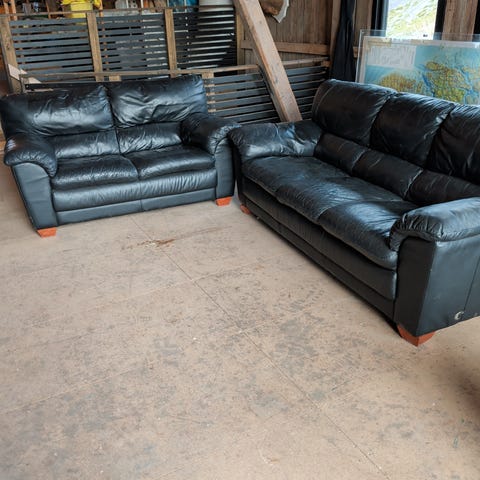 Svart skinn . Skai på siden og bak . En eier . Sofaen er fint brukt uten synlige skader. Kan ta flere bilder og sende om ønskelig . Målene gjelder 3 seter . 2 seter brede 150 cm . Bare 3 seter som kan endres til lenestol.