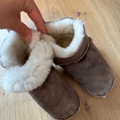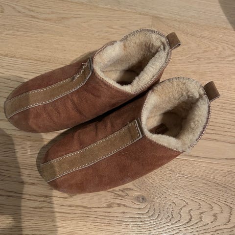Shepherd tøfler av lammeskinn, varme og myke, str 35. God tilstand. Grålig farge.