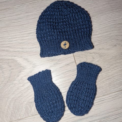 Hjemmestrikket sett, deilig og tjukk og kjennes ut som ull. Dinosaur mønster på lua med knyting, og hjerteknapper på tøflene