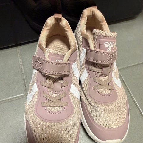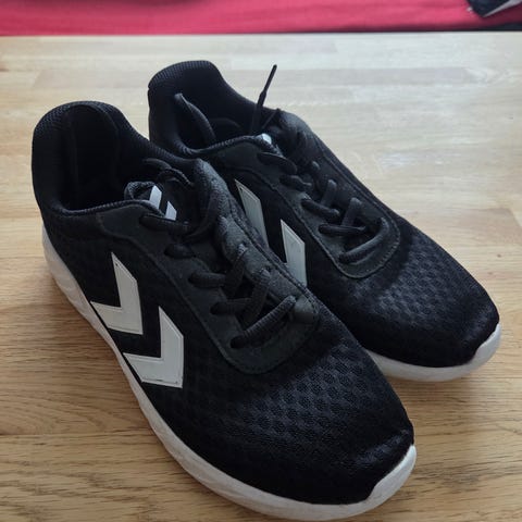 Hummel joggesko for barn/unisex i størrelse 38. Skoene er i svart med hvite detaljer og snøring foran.