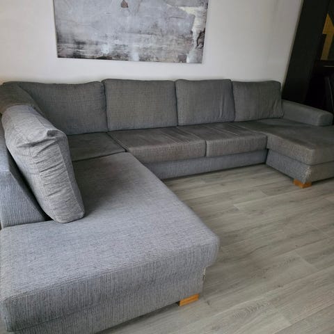 Godt brukt sofa. Fin lys grå farge. God å sitte i. Noen slitasjeskader på et par av putene, men sofaen er fin likevel. Noen flekker som trengs å vaskes bort.