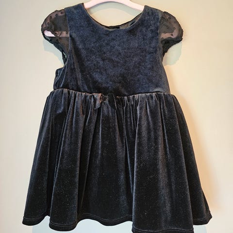 Mørk blå Polarn O. Pyret kjole for jente i størrelse 92. Kjolen er i blå polyester med myk, veluraktig overflate og glitterdetaljer. Ermeløs modell med volangdetaljer på skuldrene og liten sløyfe foran i midjen. Glidelås i ryggen for enkel av- og påkledning.