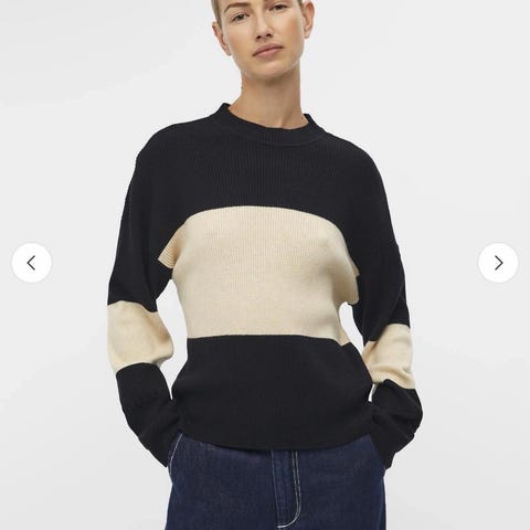 En kort, oversized genser i myk, strikket kvalitet med krage, knappestolpe, lav skuldersøm og lange ermer som smalner av nederst. Ribbestrikket kant nederst og på ermene. Lite og pent brukt, 1-2 ganger. Overvidde ca 2 x 62 cm. Lengde ca 53 cm.
