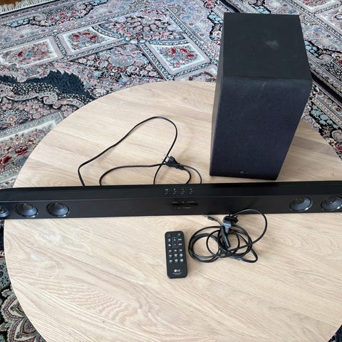 LG LAS655K lydplanke med trådløs subwoofer i svart.