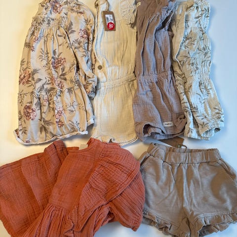 Newbie gensere i Strl 98/104. To kjoler, en cardigan og 4 gensere. Pluss to gensere på det siste bildet som er i 92, men brukt samtidig her.