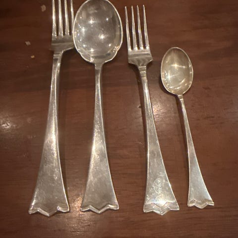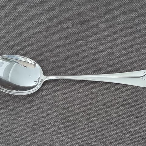 Sett med to sølvfargede skjeer i metall. Består av én større serveringsskje og én mindre teskje. Begge skjeene har dekorert skaft med vifteformet avslutning. Egner seg til servering av mat, desserter eller som del av et bestikksett. Vekten på settet er ca. 22 gram ifølge bilde av kjøkkenvekt. Rådhus med vifte selges samlet 15 cm og 12 cm 600kr for begge