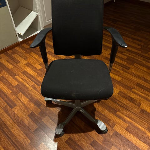 Vi gir bort kontorstolen vår som er pent brukt! Man kan ta den opp og ned - og lene seg bakover.