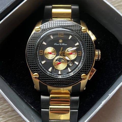 Veldig god stand. Fungerer fint. Glass og stål har ingen synlige riper, og klokken har ingen mangler. Den har originalremmen i svart skinn, men kan byttes ut.